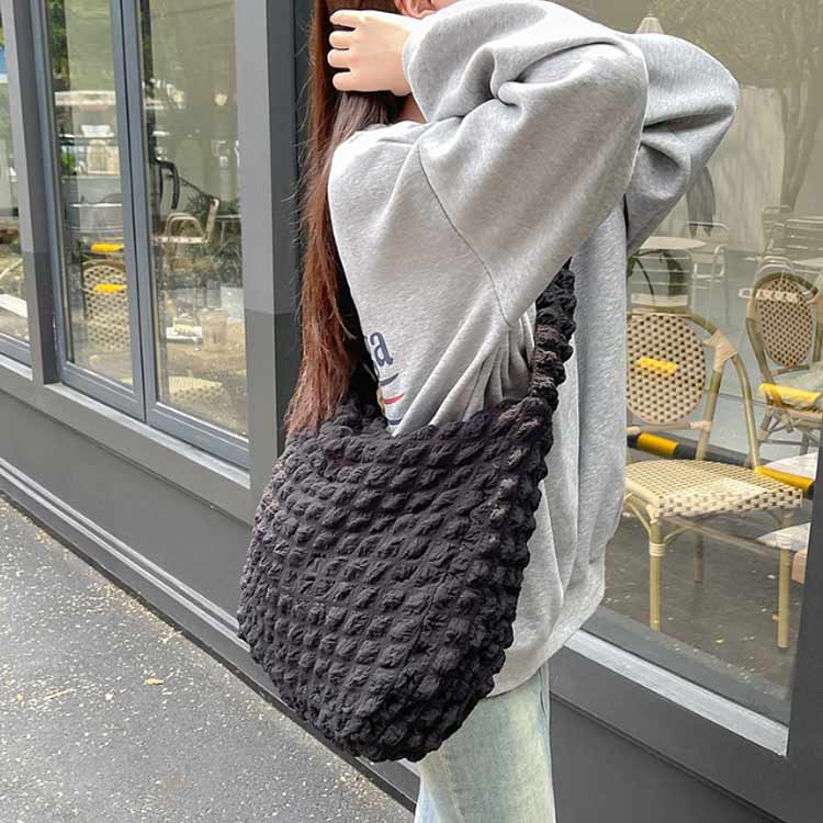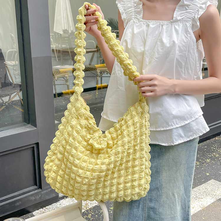ポコポコしたポップコーンバッグはまるでのように柔らかで肌触りよ、季節問わず通年使えるシーズンレスなバッグです。