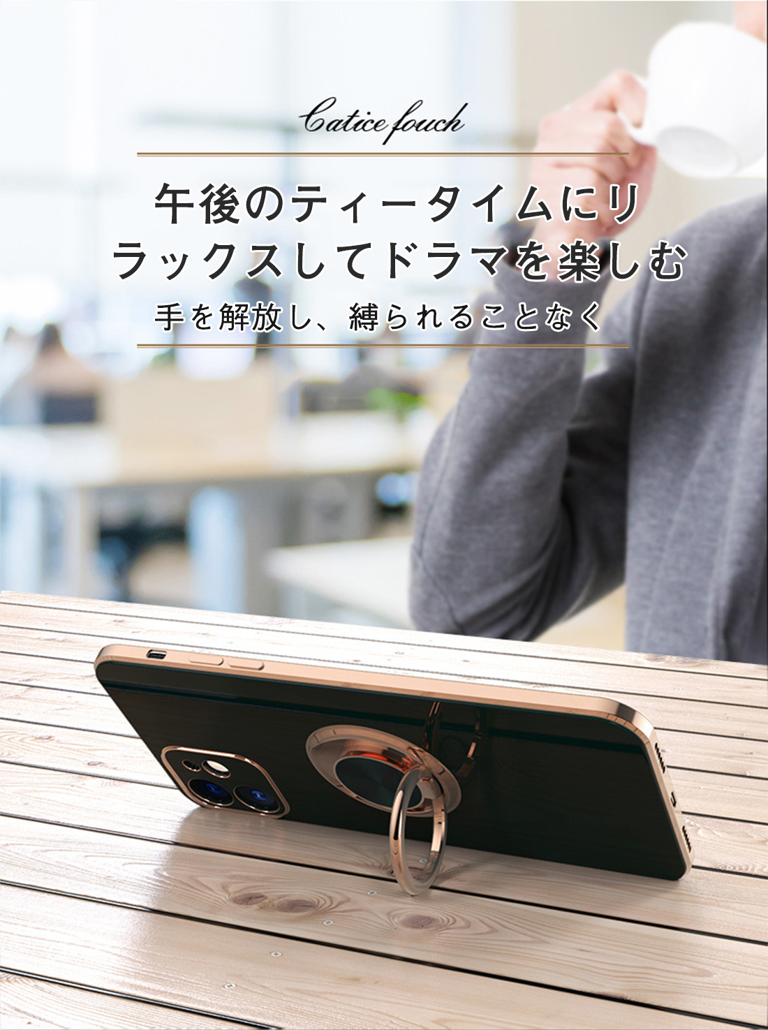 ・持ちやすさと安定性が抜群。リングに指を通せば操作性も向上、画面の隅まで届く。混雑したバスや電車の中でも片手で安定した操作が可能。