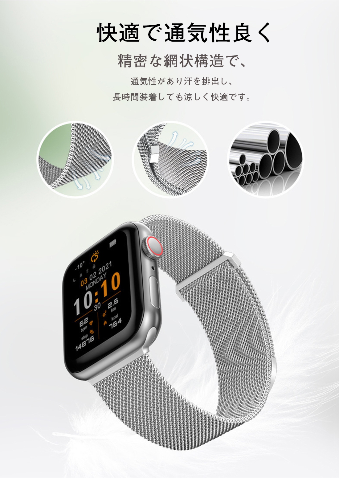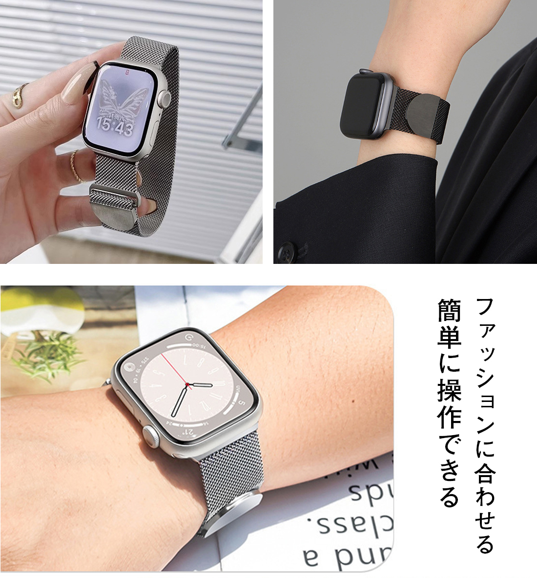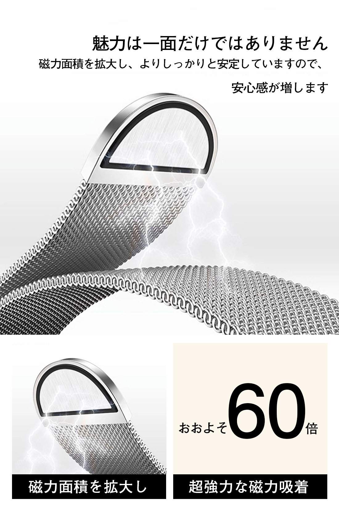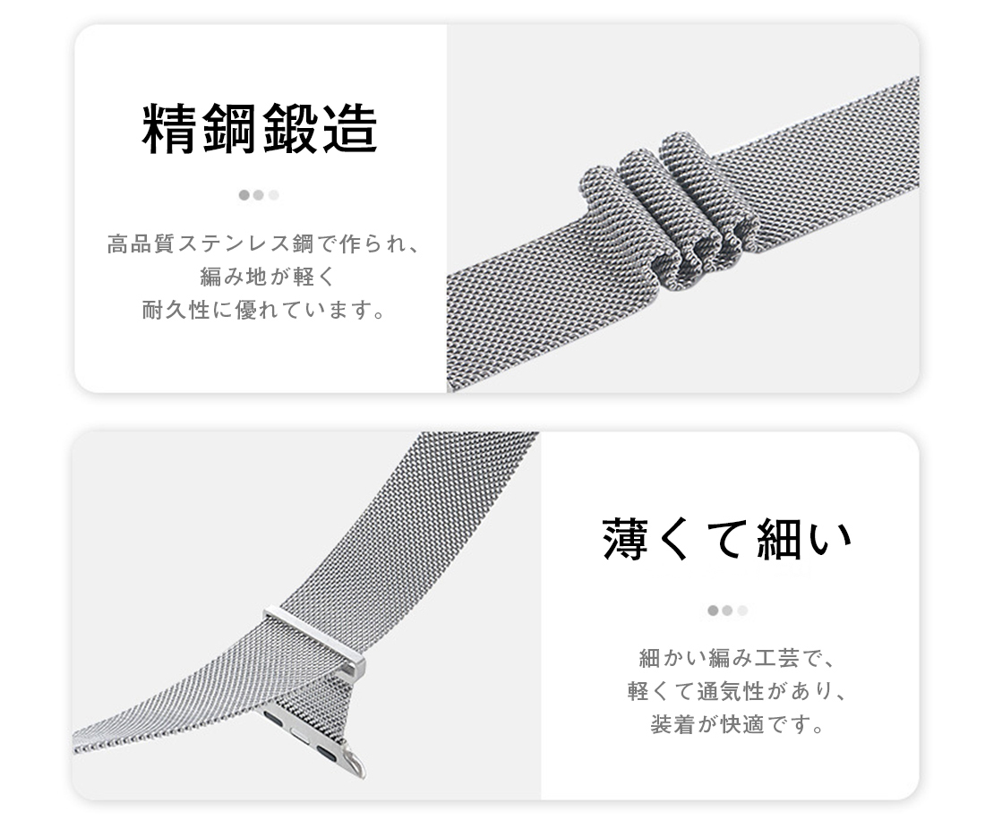 マグネットのデザインなので、自動吸着、取り外しと取り付けは簡単であり、またバンドの長さを簡単に調節でき、完璧にフィットします。