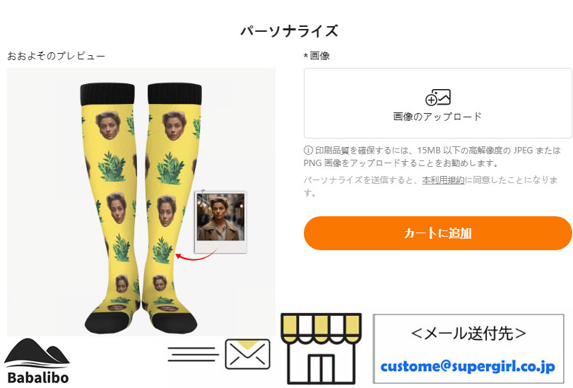 ご注文後、カスタム写真を下記のメールアドレスにお送りいただけますようお願い申し上げます。