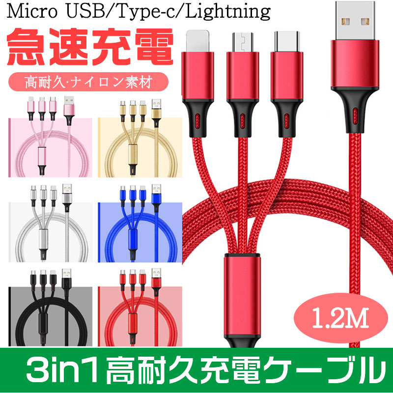 iphone15 急速 3in1 充電 ケーブル 長さ1.2m マルチ充電ケーブル iPhone microUSB type-c マルチケーブル アンドロイド ライトニングケーブル