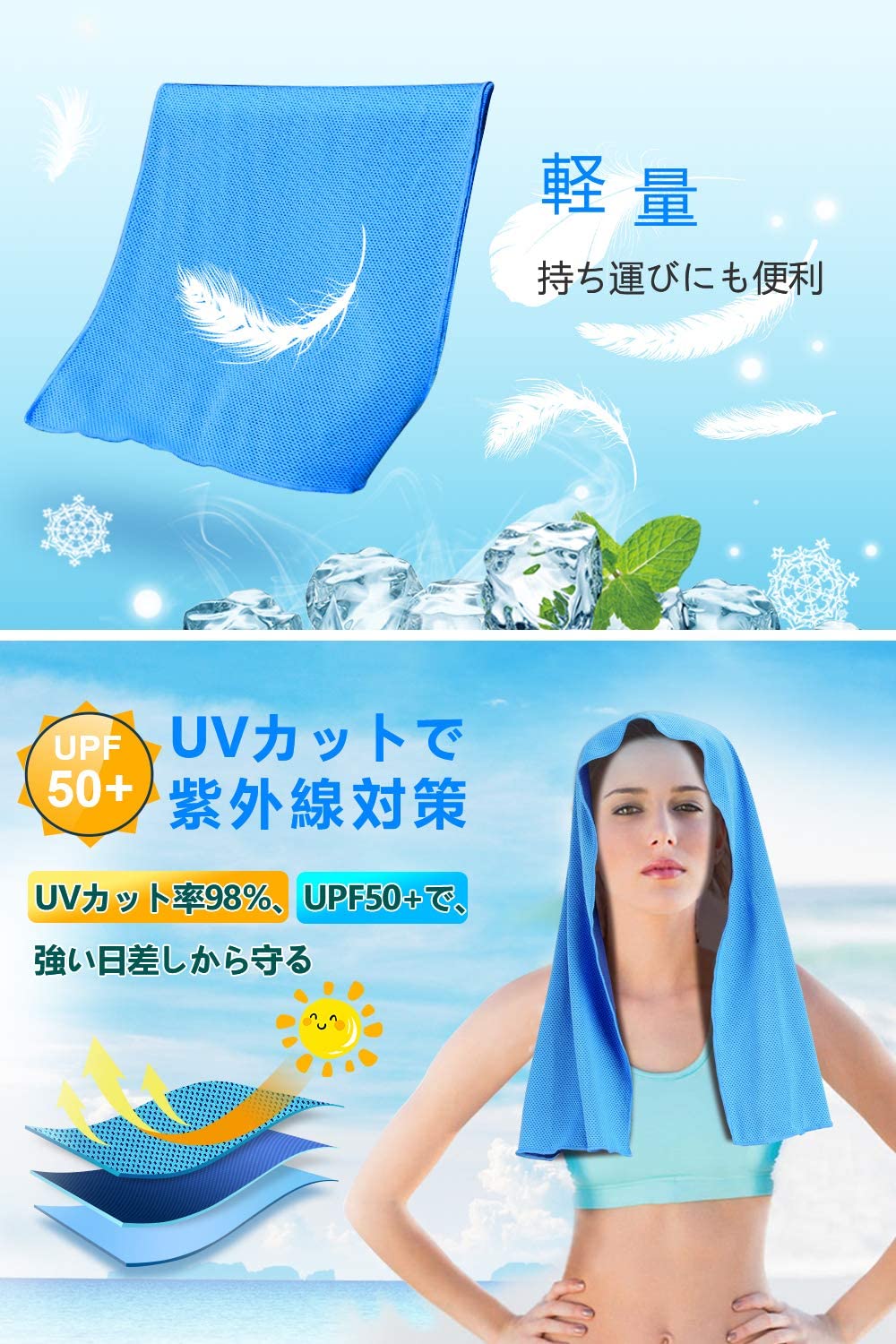 UVカット・日焼け対策 冷却タオルのUVカット効果は98%と高めで、屋外での日焼け対策にも最適です。首に巻いておけばひんやり感を得られる上に、首周りの日焼けも防止もできます。そのため、庭仕事をする方や海やプールで活用したい方にも適しています。