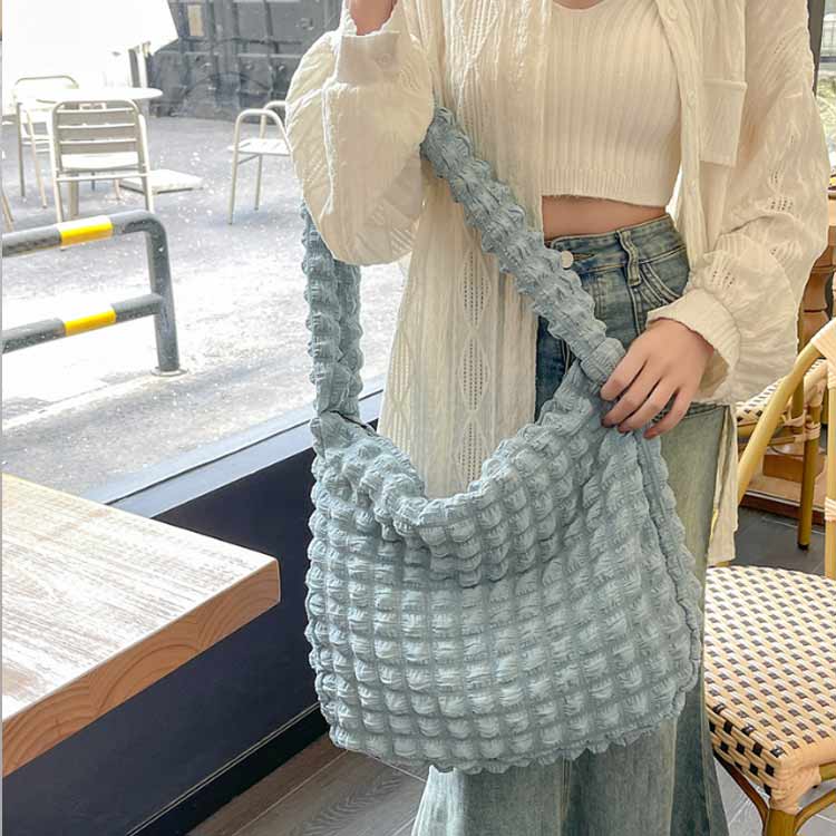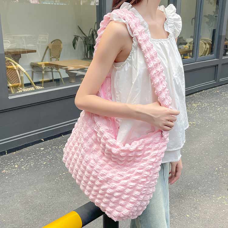 ポコポコしたポップコーンバッグはまるでのように柔らかで肌触りよ、季節問わず通年使えるシーズンレスなバッグです。