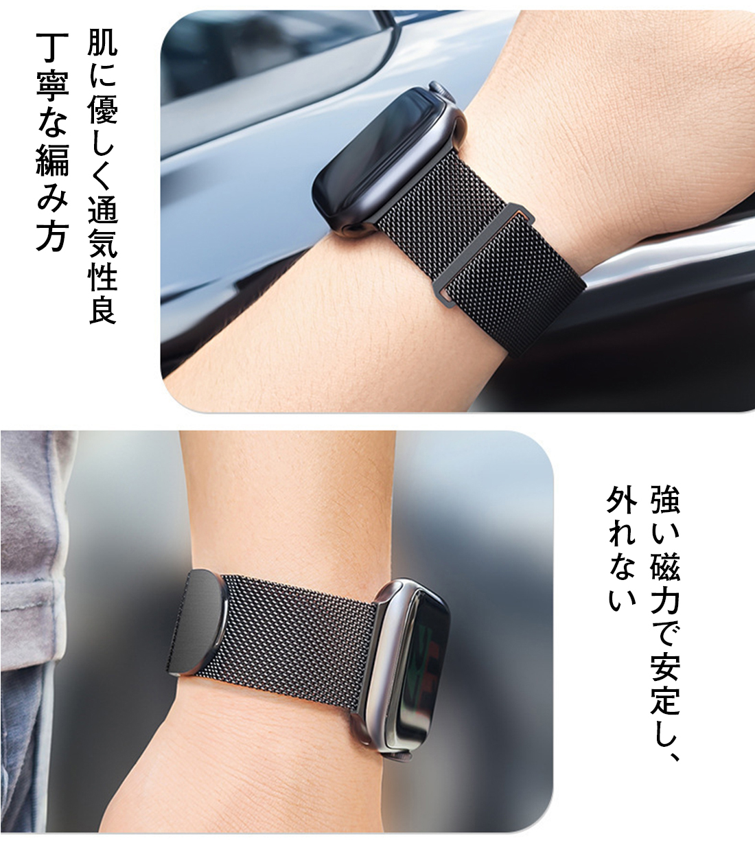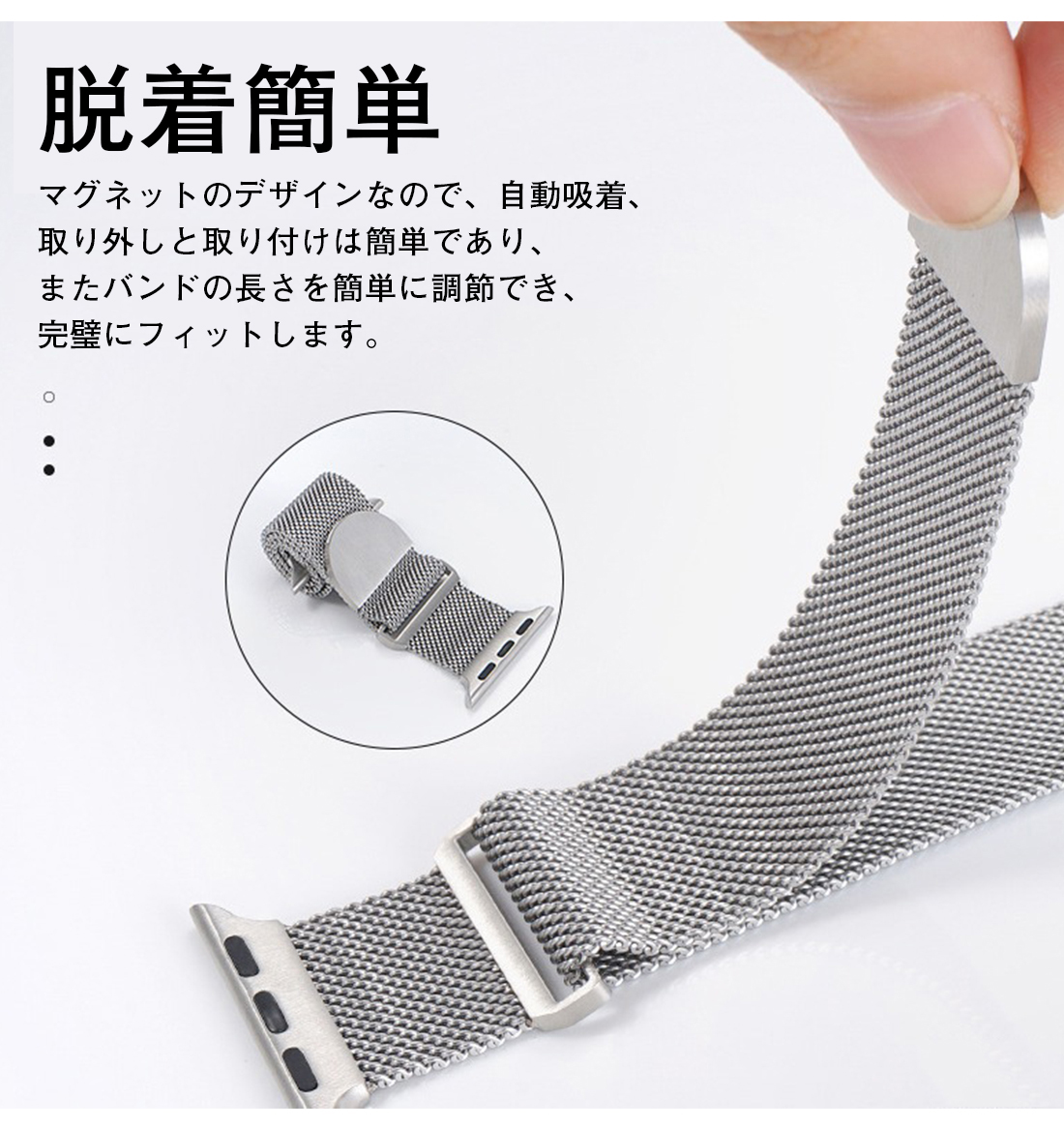 マグネットのデザインなので、自動吸着、取り外しと取り付けは簡単であり、またバンドの長さを簡単に調節でき、完璧にフィットします。