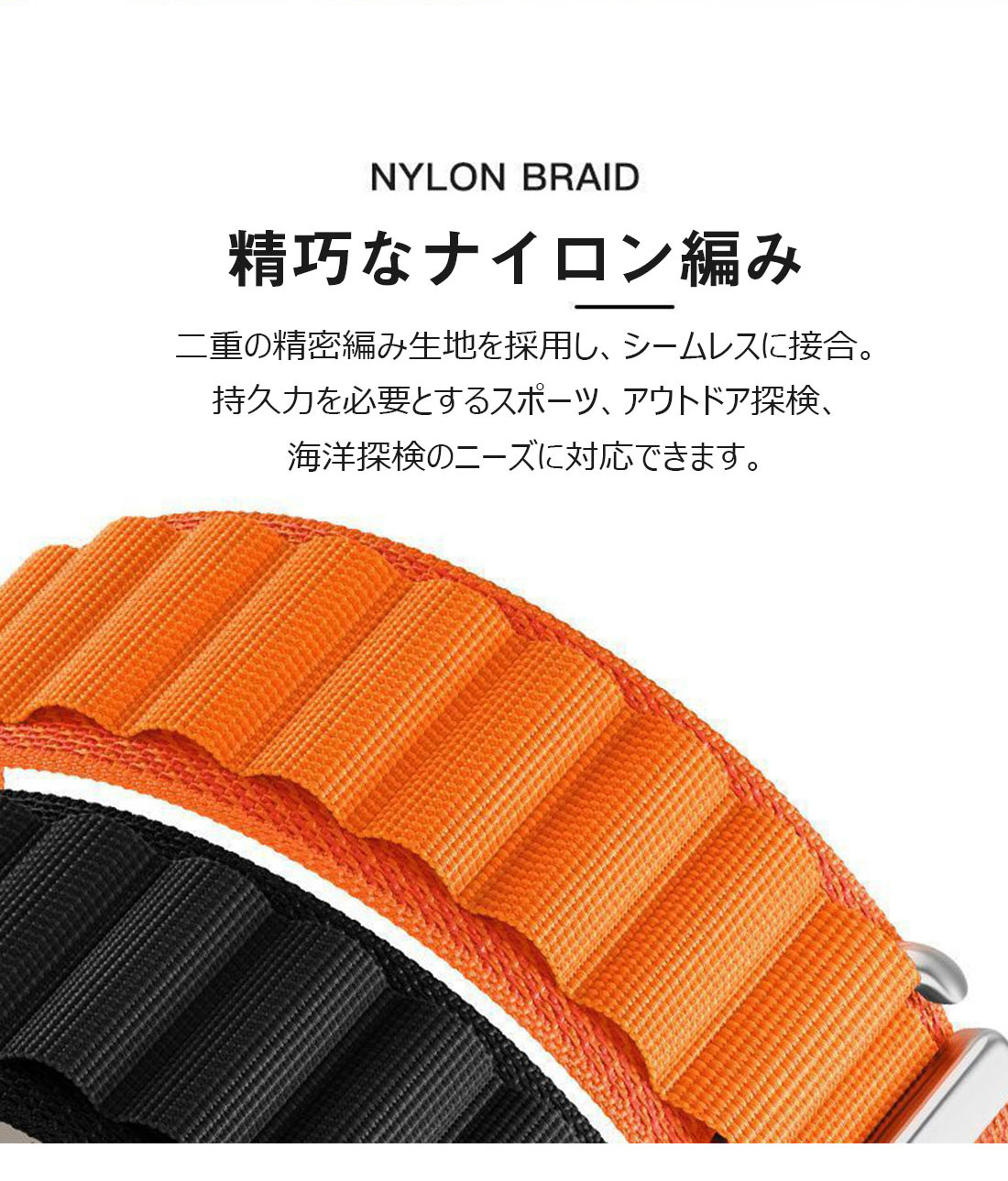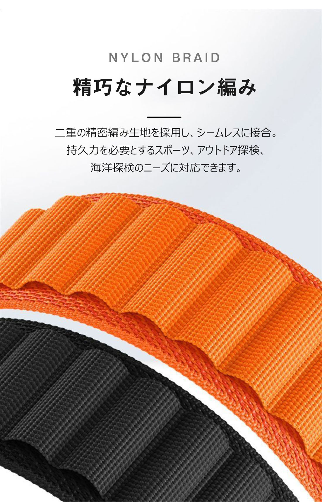 ※2層のナイロンとポリエステル生地をシームレスに織り込むことで、縫い目も切れ目もない強靭のバンド。
