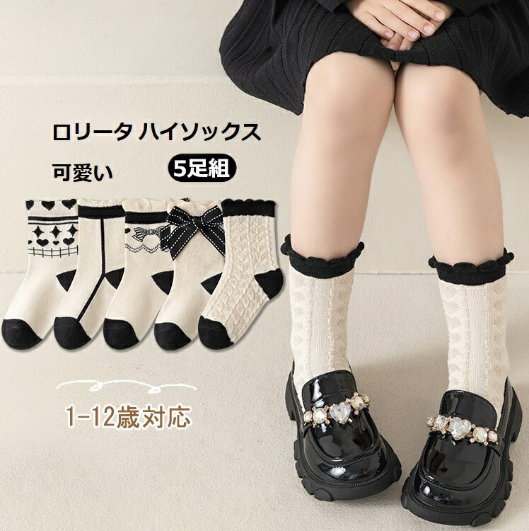 靴下 女の子 リボン付き ソックス 春秋 キッズ 子供靴下 黒 白 ホワイト キッズソックス ロリータ ハイソックス 可愛い
